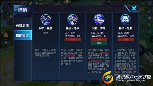 兰陵王是一个典型的刺客英雄,他的刺杀能力非常出色,虽然缺乏了一定的收割能力,但是他对后排的影响是毋庸置疑的。大招的超长时间隐身让兰陵王随时能够贴近敌方后排,也很难被对手针对。