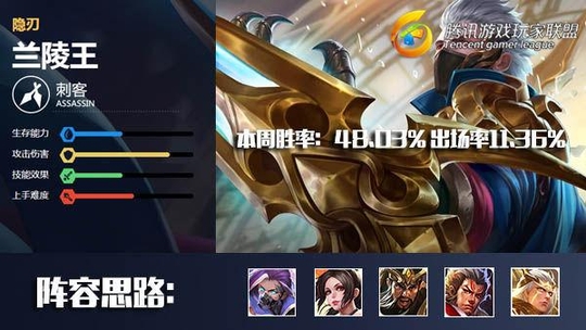 兰陵王本周胜率为48.03%,出场率为11.36%。胜率目前排在第58位,而出场率排在第31位。兰陵王的胜率不算太高,排在靠后的位置,这主要是因为兰陵王太过注重前期,前期的兰陵王优势非常大,但是越往后拖兰陵王的优势就越小,钻石及以下分段的玩家居多,这些分段的玩家滚雪球能力很弱,兰陵王带节奏能力再强也必须依赖队友才能奠定胜势,所以总体胜率不会太高。出场率处于中游的位置,兰陵王的单兵作战能力很强,所以深受玩家的喜爱,单杀是兰陵王的拿手好戏,喜欢单杀的玩家也不在少数。