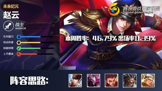 赵云本周胜率为46.79%,出场率为11.39%,赵云的胜率目前排名67位,处于全峡谷靠后的位置,因为赵云在削弱之后使用难度大幅度增加,失误率提高,新手很难把握好赵云的进攻时机,所以不是非常熟练赵云的玩家胜率总体不会太高,而擅长赵云的高手数量较少,就造成了平均胜率偏低的情况发生。赵云的出场率排在第30位,处于中游水平,坚持赵云的玩家不在少数,他的技能不算华丽但却都很实用,实战发挥可圈可点。