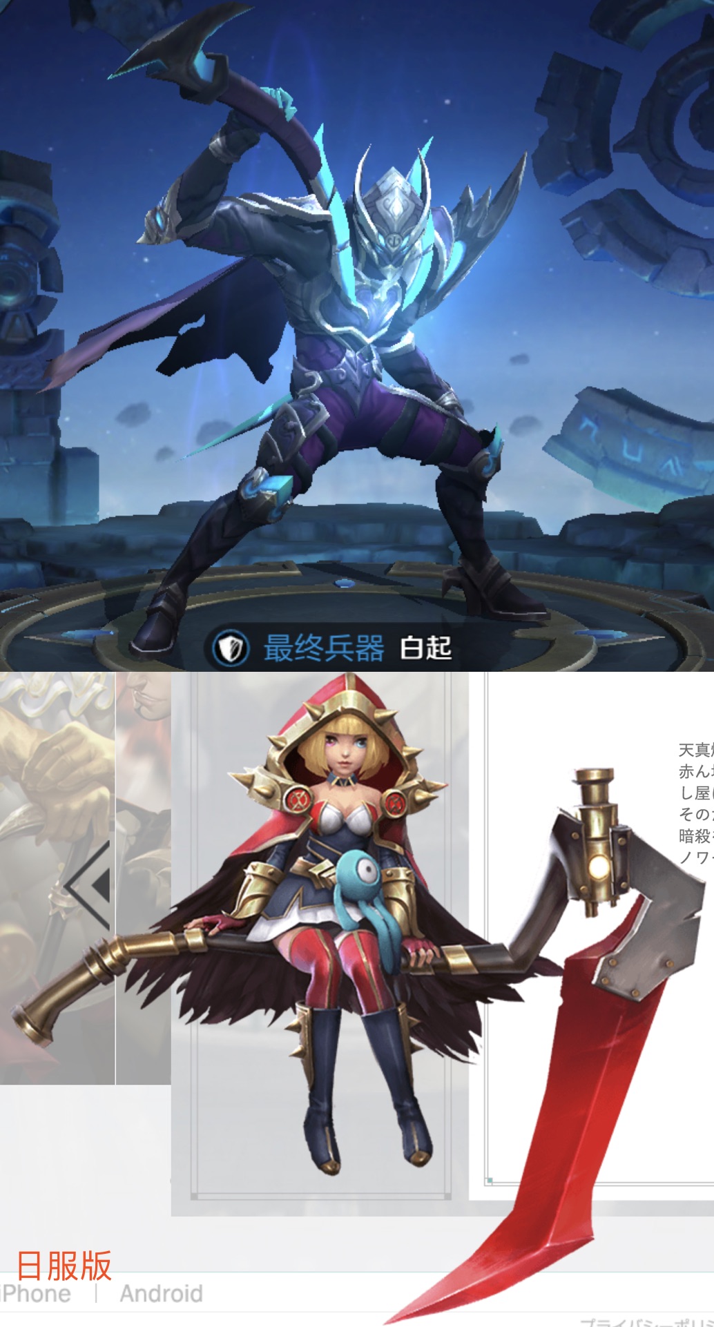 上面这张图里的白起,和日服对应的则成了女角色,差别算是最大的一个。
