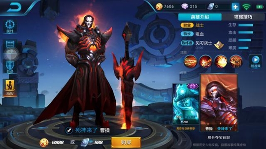 死神来了是曹操一款比较好看的皮肤,带有全特效,价值预估在600元左右,因为拿到他的几率是跟冰冠公主差不多的,所以稀有度一样珍贵.