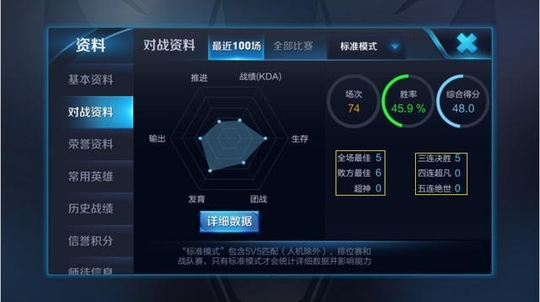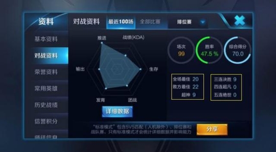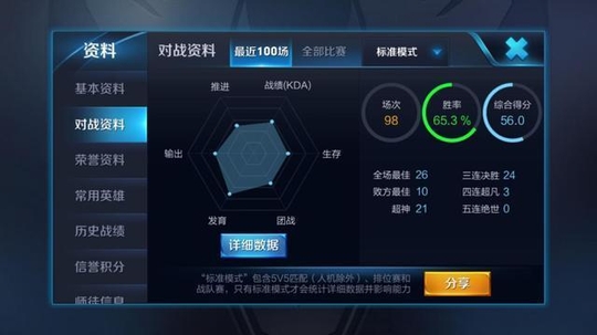 在村长看来用段位、胜率之类的数据看一个玩家的水平有时候真的不准,只有这个对战资料是最靠谱的。只要是过了60的在同等段位上绝对是技术很好的,50以下百分百有点坑。