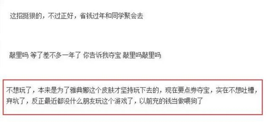 还有玩家表示“本来为了等到雅典娜皮肤才有动力玩下去,现在要点券夺宝,压岁钱可算是省下了”。