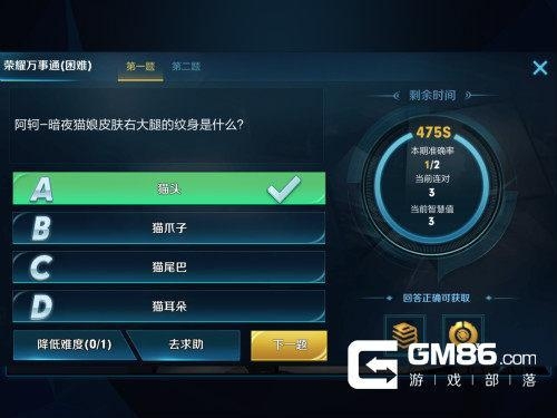 正确答案是A猫头,说实话小编在对照阿轲暗夜猫娘皮肤看的时候真心分不清楚是猫头还是帽耳朵,这是感觉猫头的可能性大些,结果还是选对了。