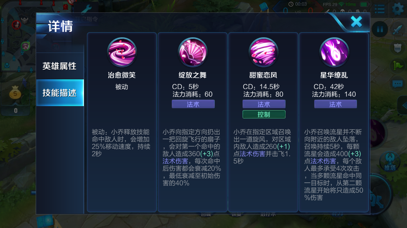 小乔召唤流星并不断向附近的敌人坠落,造成法术伤害。该技能范围较大,且可以边走边打击敌人,在追击和撤退时都能给以敌人有效的打击。