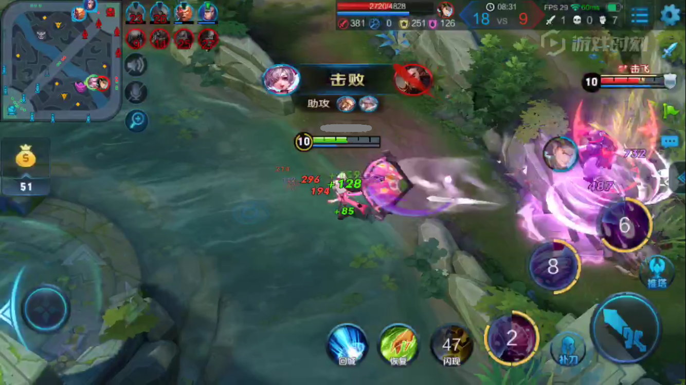 小乔的扇子伤害很高,距离较远,尽量同时打到敌人小兵和英雄。