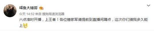 不知不觉,S10赛季就这样来了,新英雄公孙离登场,五军模式正式上线,大神玩家们也开始乐此不疲的冲上了他们赛季的第一个王者。不知大家是否还记得S9赛季不上王者不下播的主播大锤,这个赛季他又来了,这次大锤仿佛有备而来,开局就立下flag,这次两点之前不上王者送10万点券!实在是豪气!