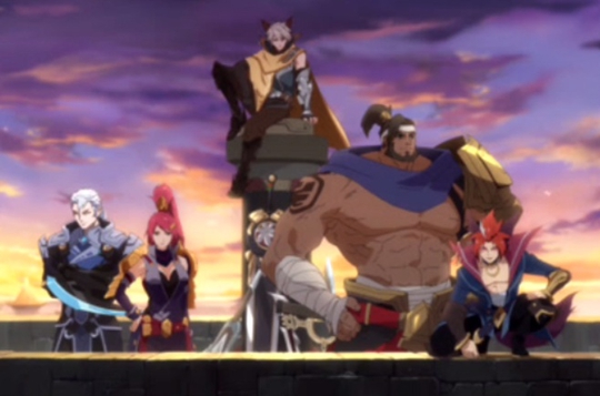 第二个视频是长城守卫军五人小队协同作战的动画,视频中开始是花木兰被暗箭偷袭,玄策帮助她当下箭矢,然后五人在长城上抵御西域魔种进攻,互相携手互助的战斗场景。