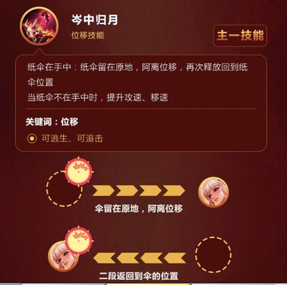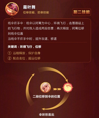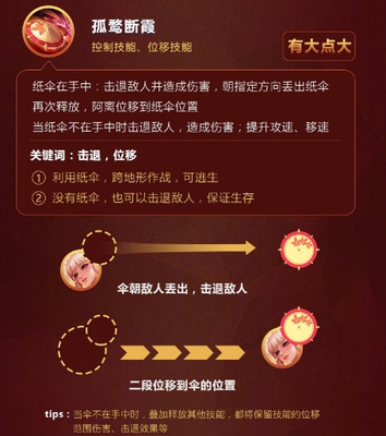 然后就是大招了,她的大招既有伤害,还能控制更能位移。可以说是非常全面的。另外,大家看下面有一个小提示,就是伞不在手中的时候也可以释放其他技能。同样有技能的位移和伤害,击退效果。所以不用每次都等到伞回来再释放技能。