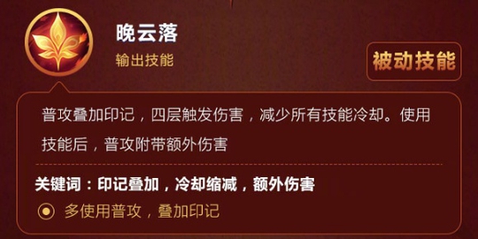 再来看看技能介绍,这个是被动技能,主要承担一部分的输出效果,关键是要多使用普攻才能叠加印记。因此攻速装对她也比较重要。