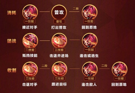 这里就是官方的几个连招介绍,消耗主要是使用一技能。打几下,然后再回来;团战就是使用的321连招。既有一定的消耗和抵挡技能的作用,最后还能成功逃生,就是这种飘逸需要一定的练习。至于收割就看大家的灵活应用了。