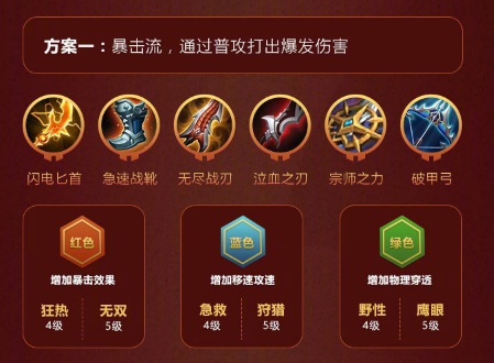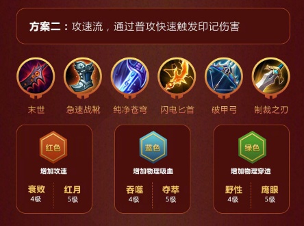 至于第二套装备,是官方推荐的攻速流,这套就需要连续普攻来叠加印记造成伤害了。相对来说,英雄会更危险一点。但是伤害肯定也会高一点。就看大家如何抉择了。
