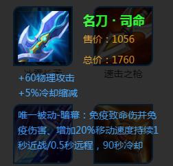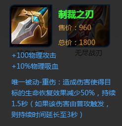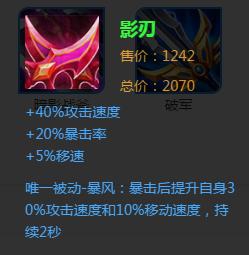 讲解:与电刀比较类似的一件装备,电刀偏向于暴击,影刃偏向于攻速,同样适合高暴击的adc使用。