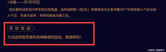 在公布投票结果之前,果酱给大家先说一下:在投票的公告中,官方表示总决赛获胜的英雄有神秘福利。对于这个神秘福利,网上有很多的说法。