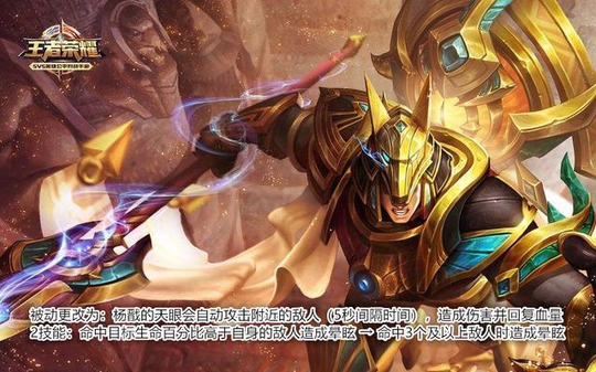 杨戬是要出狗年限定皮肤的英雄,这次改动将被动改成了可以自动攻击附近的敌人,5秒一次在造成伤害的同时还能回复血量,这个就厉害了。