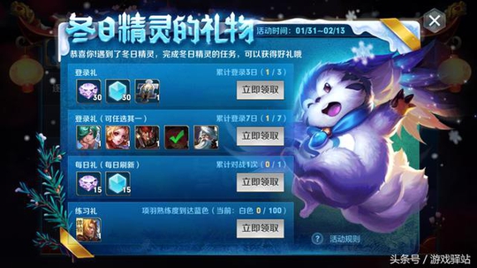 除此之外玩家还可以进入游戏大厅右侧的活动面板→限时活动中参与冬日精灵的礼物,活动时间为1月31日—2月13日,玩家只需完成四个简单的任务的就能获得永久英雄(五选一)、英雄碎片和铭文碎片等,值得一提的是永久英雄不会提示已拥有,建议完成任务的小伙伴去仓库看看是否已拥有想要的英雄,避免重复领取!