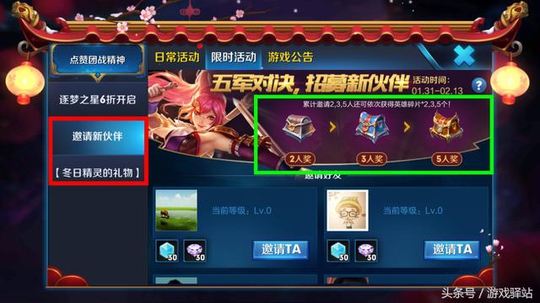 第二个活动和老玩家福利同步开启名为五军对决招募新伙伴,同样为期两周时间,玩家只需邀请2/3/5个好友即可获得2/3/5个英雄碎片,合计最多能获得十个,该活动适合小号多且没有登录游戏的玩家!