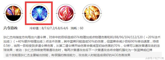 首先一技能,狄仁杰向指定方向甩出六道令牌,造成一个扇形的AOE伤害,且令牌能触发普通攻击的发球死熬过,蓝牌具有减速效果,红牌可造成物理与魔法双重伤害,团战中如果能往人堆里丢一个简直不要太爽!