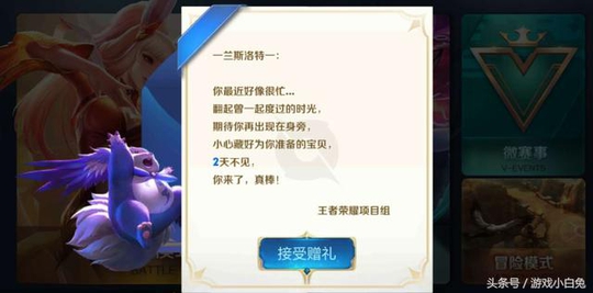 王者荣耀最近出了一个隐藏活动,这个活动叫冬日精灵的礼物,本来是只有离线一段时间的玩家才有的回归奖励。但是一位V8玩家两天不上线,天美直接送永久新英雄公孙离,而且这个活动的奖励还会发2次的。