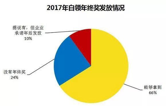 据智联招聘 2017白领年终奖调查:66%表示自己能拿到,另还有10%表示年后可能有,只有24%与年终奖无缘。