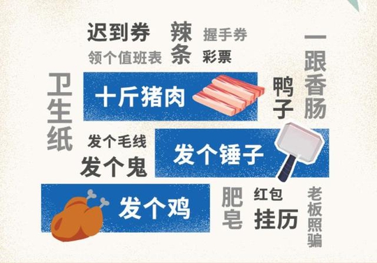 还有更让人哭笑不得的福利,比如榴莲、卫生纸,甚至馒头——寓意“蒸蒸日上”等等。