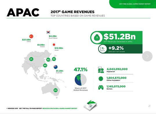 据艾瑞2017年中国游戏产业报告统计,2017年国内游戏产业付费产值为2167亿人民币,超越美国跃居世界第一。看全球,NEW ZOO报告显示,2017年全球游戏付费总产值为1087亿美元,约合人民币6834亿民币。