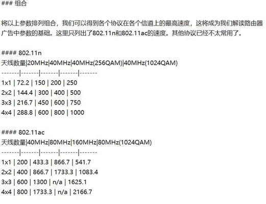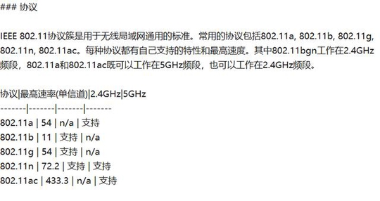 有常用的协议802.11n和802.11ac,高通曾推出无线方案,测试得出802.11n的最高速率可达200m,802.11ac的最高速率可达541.7M. 802.11ac这个协议支持2.4Ghz和5GHz拥有这个参数的路由器信号更好,速度更快。