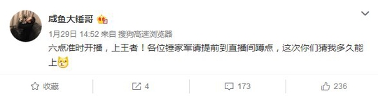 在1月28日的时候大锤哥就在微博中发布自要在8个小时上王者,粉丝也在留言中给大锤加油打气,也有网友留言,是时候去狙击直播的大锤了。