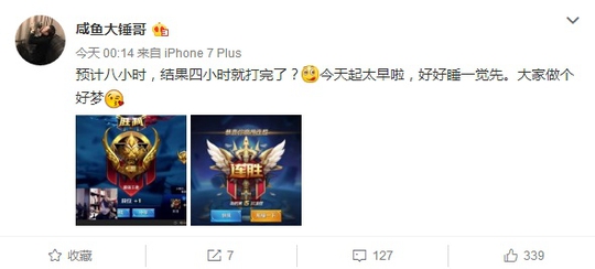 原本预计8小时上王者,大锤自己也没想到在15连胜上王者。也是兴奋的睡不着起了一个大早。