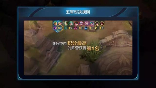 从“五军对决”的玩法机制上看,每局时间由15分钟到30分钟不等,改变为固定8分钟,对战人数也从5V5的两军对战,变动到2人一组的5队模式。这样一来,游戏当中不仅加速了玩家与玩家间的冲突以及游戏节奏,更满足了用户对游戏时间碎片式的需求。