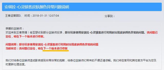 事情的缘由是这样的,该玩家一大早在打游戏的时候发现他的安琪拉新皮肤的头发颜色是黑色的,于是来找我秋后算账了,经过我与他一番解释,最后终于搞懂了原因是出在官方上面,官方也是在出bug之后就公布了,我能说什么呢?我只能说你还挺可爱的哈!