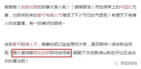 很久之前就看到很多玩家在官博下留言询问春节时到底会不会有限定皮肤返场,并且出现了很多催霸王别姬返场的玩家。在今天游戏官微爆料诸葛亮限定皮肤武陵仙君的消息中,确定了春节会有限定皮肤返场!