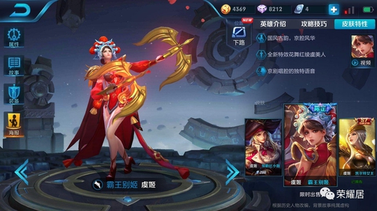 不知道大家是否猜出来了呢?虞姬的霸王别姬限定皮肤,几乎是符合了以上的所有线索。展示界面会有飘花效果,中国红的配色,和项羽组成了CP皮肤。至于飘带,虞姬这也应该算是吧?
