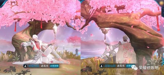 官方公布的皮肤模型页面的效果图,诸葛亮身倚桃树,桃树后的石头上刻着“桃花源”三个字,符合历史上的武陵仙君真实情况。
