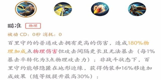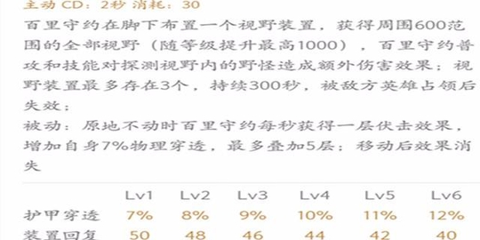 一技能的被动效果提升了百里守约的站桩输出能力,持续的定点普攻让敌人无法承受,二技能瞄准时同样会提供一技能被动伏击效果,尽量叠加到5层时消耗伤害效果最佳。初期满层就有35%的护穿能力,随等级提升穿透越强。