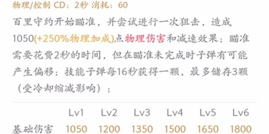 二技能作为百里守约的核心输出技能,能在远距离轻松消耗敌人血线,尤其体现在初期二技能命中敌人后压血能力强大,敌人被击中两次只能被迫回城损经验丢塔从而拉开双方差距。技能的基础伤害很高初期压制了强,随等级提升伤害有一定成长,减速效果一般,子弹最多储存3颗储备时间受冷却缩减影响。注意的是二技能瞄准需要2秒时间准备,提前施放子弹会有所偏移。