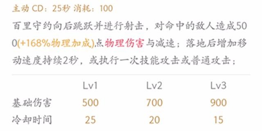 百里守约的位移技能,施放时向后跳跃并射击,对直线内敌人造成伤害及减速,后跳落地提供移速加成,一般作为逃脱或追击敌人使用,三技能可以跨越一些中小地形来躲避敌人追击。技能基础伤害及物理加成可观,冷却时间偏长随加点等级提升而减少,三技能处于冷却时百里守约机动性差尽量离开敌人视线,利用二技能猥琐输出。