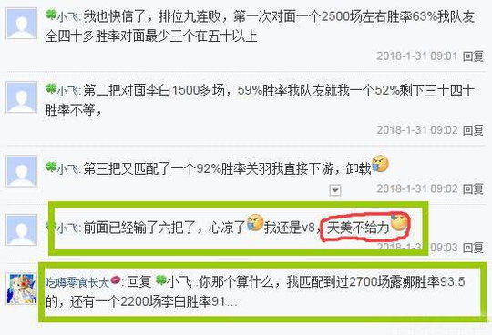 网友对天美的解释,并不满意。随后砸开了锅。网友:“前面输了6把,我还是V8,天美不给力。你那算什么,我匹配到2700场露娜胜率93.5的,还有2200场李白胜率91点多的......”