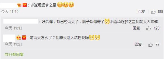 但也有玩家以嘲讽之意在评论,求返场刚下架的逐梦之星,也是在表达对官方返场霸王别姬的不满。看来这一次官方要镇住返场言论,只能采用之前玩家提供的建议:全部皮肤返场,每人限购一款。