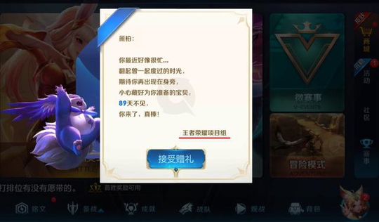 信封中话语诚恳,让人有些忍俊不禁,而信函的署名为王者荣耀项目组,信封上有个“接受赠礼”,好像还有额外的礼物呢!看来天美为了挽留玩家真的是用心良苦啊!