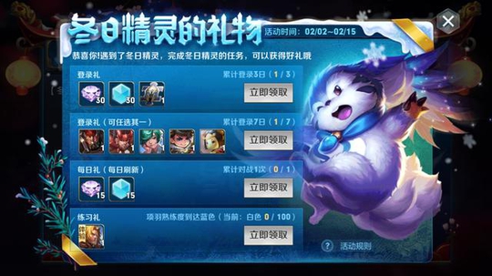 然后这位玩家就找到了这个!这个限时活动的名称叫做冬日精灵的礼物,而最好的奖励就是永久英雄!而且是有5个英雄可以选择!只不过只能5选1,而且这些英雄几乎都是新手英雄,不过值得注意的是,活动时间只限2月2号到15号,活动时间很短。
