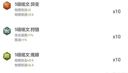 铭文推荐:①暴击符文(10无双、10鹰眼、10狩猎)就带上一刀几千的感觉不是吹的,②百穿铭文(10异变、10鹰眼、10狩猎/隐匿)③有什么铭文带什么不管什么肉啊或者法师铭文问答都不大,一个英雄一般来说在三件装备过后对铭文需求就不大了(除了夺萃和无双)。