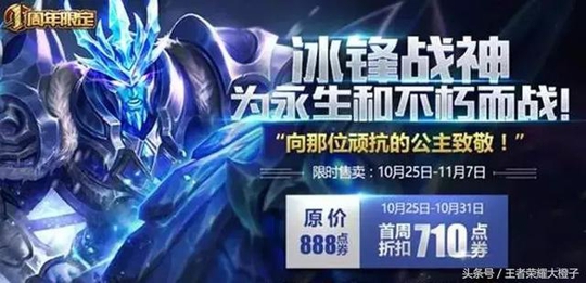 关羽-冰锋战神皮肤,首次上线时间:2016年10月25号,如果返场,售价888点券(不打折)