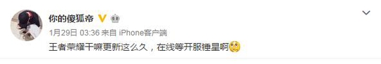 早在29日开服前几个小时的凌晨三点,这名年轻气盛的小伙子在游戏版本更新前就已经摩拳擦掌发布了微博坐等开服进入100连胜极限上分模式,蓄势待发。