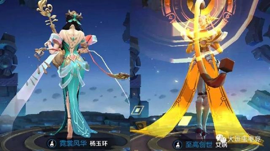 新英雄都有属于自己的燕尾服,第一法师王女娲,女娲的燕尾服是峡谷最长的,上线已经有点时间了,在时效上说,还可以说是新英雄,在所有英雄里面也是最好看的,还有体验服的杨玉环,看来有点想纱,或者丝带,结合杨玉环这个英雄还是很水性杨花的。
