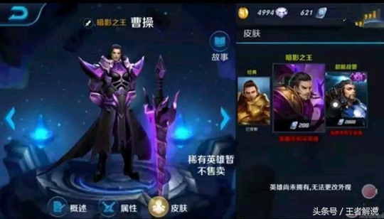 第二位,暗影之王。暗影之王的稀有度就不用多说了。一样是仅存在于历史中的皮肤。很多小伙伴也都是听说过没见过吧。各位小伙伴可以留意一下,是不是每个英雄上线都会有一款288皮肤?但是各位小伙伴还可以看一下,为什么曹操没有288,却只有一个388,也就是那个未来战警。其实暗影之王与未来战警基本上是一样的,外形和特效相差不多,至于为什么下线暗影之王,这个王者解说就不清楚了