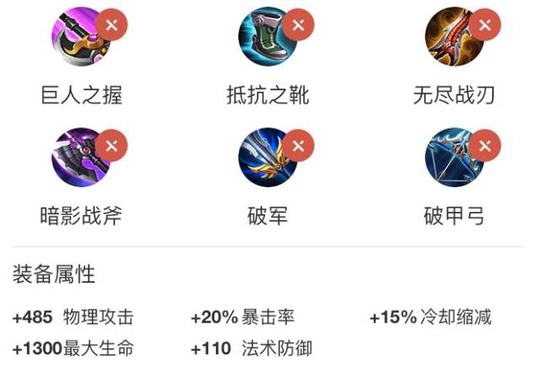 无尽和暗影是核心装备,毫无疑问!因为阿轲的技能效果,暴击最强的装备无尽成了阿轲的必需品,甚至还常常看见有人第一件装备就出无尽。暗影战斧也是一件很强的装备,对于脆皮来说尤为致命!攻击力,生命,冷却都很好!