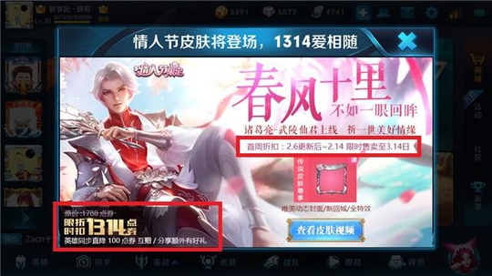这款皮肤于6号正式上线,从2月6日-2月14日期间,限时折扣1314点券(天美你出来,这是几折!完全是强行折扣)。这款诸葛亮的情人节皮肤,原本是非常的骚粉,不过为了照顾大部分玩家,改成了比较能接受的红色,不过特效依然是粉红的桃花,当然看起来也还不错,还有回城特效,还有送头像框呢!毕竟是情人节限定+传说级别的皮肤。