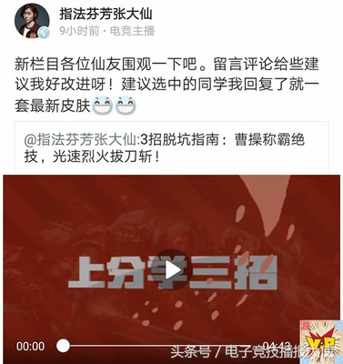 然而斗鱼方面一直把重心都放在了与蛇哥的斗争上,基本上没有去管张大仙这件事。所以说,事到如今张大仙自己也不得不做出一些应对了。之前使者曾表示过,虽然企鹅电竞要求禁播,但是现在视频创造这么火热,因此这也是他的出路。最近张大仙推出了新栏目,其实也就是关于《王者荣耀》的解说,视频中会介绍一些英雄的出装、铭文搭配以及具体打法,是非常不错的。下面这一期是关于曹操的打法,因为新赛季烛龙的皮肤是给大曹操的,所以大仙也很细心就推出了这期栏目。