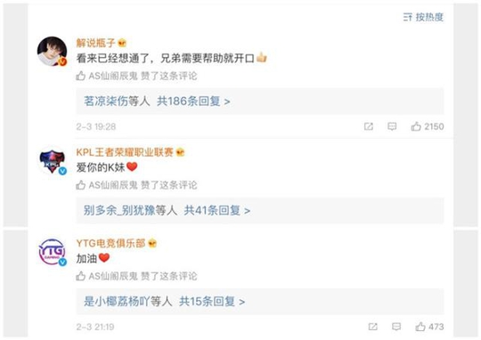 K妹和解说瓶子以及YTG战队在微博送上真挚的祝福。